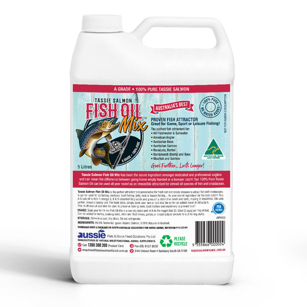Use our irresistible Tassie Salmon Fish Oil Mix all year round. It's the perfect fishing attractant and preservative for fresh bait and it slowly releases to attract all types of fish.